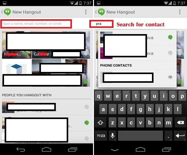- Select a contact for your Hangout by typing the person’s name, email address, or phone number in the search box. You can also select one of your contacts from the lists below the search box.
